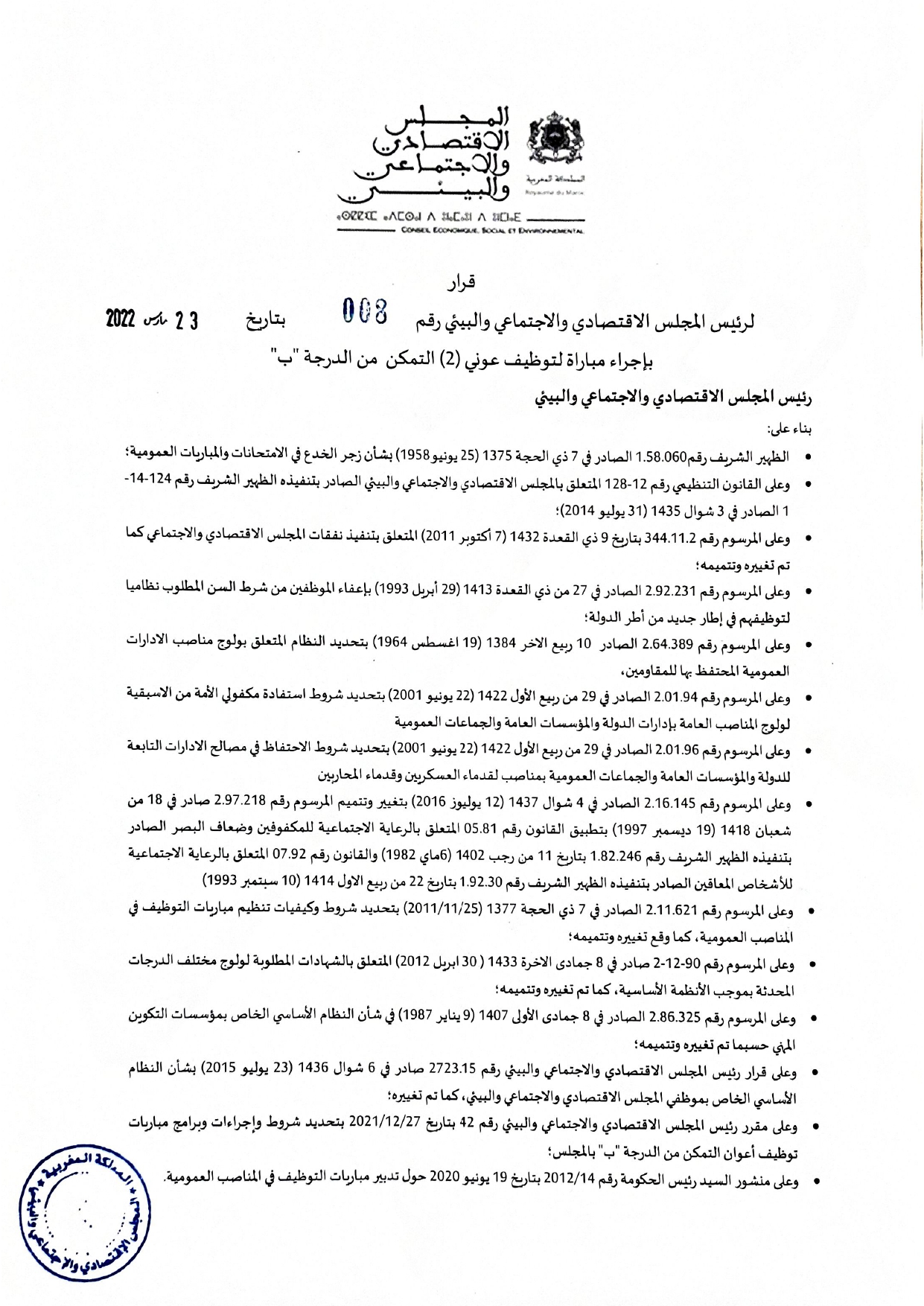 المجلس الإقتصادي والإجتماعي والبيئي مباراة توظيف 04 مناصب آخر أجل 6 ابريل 2022